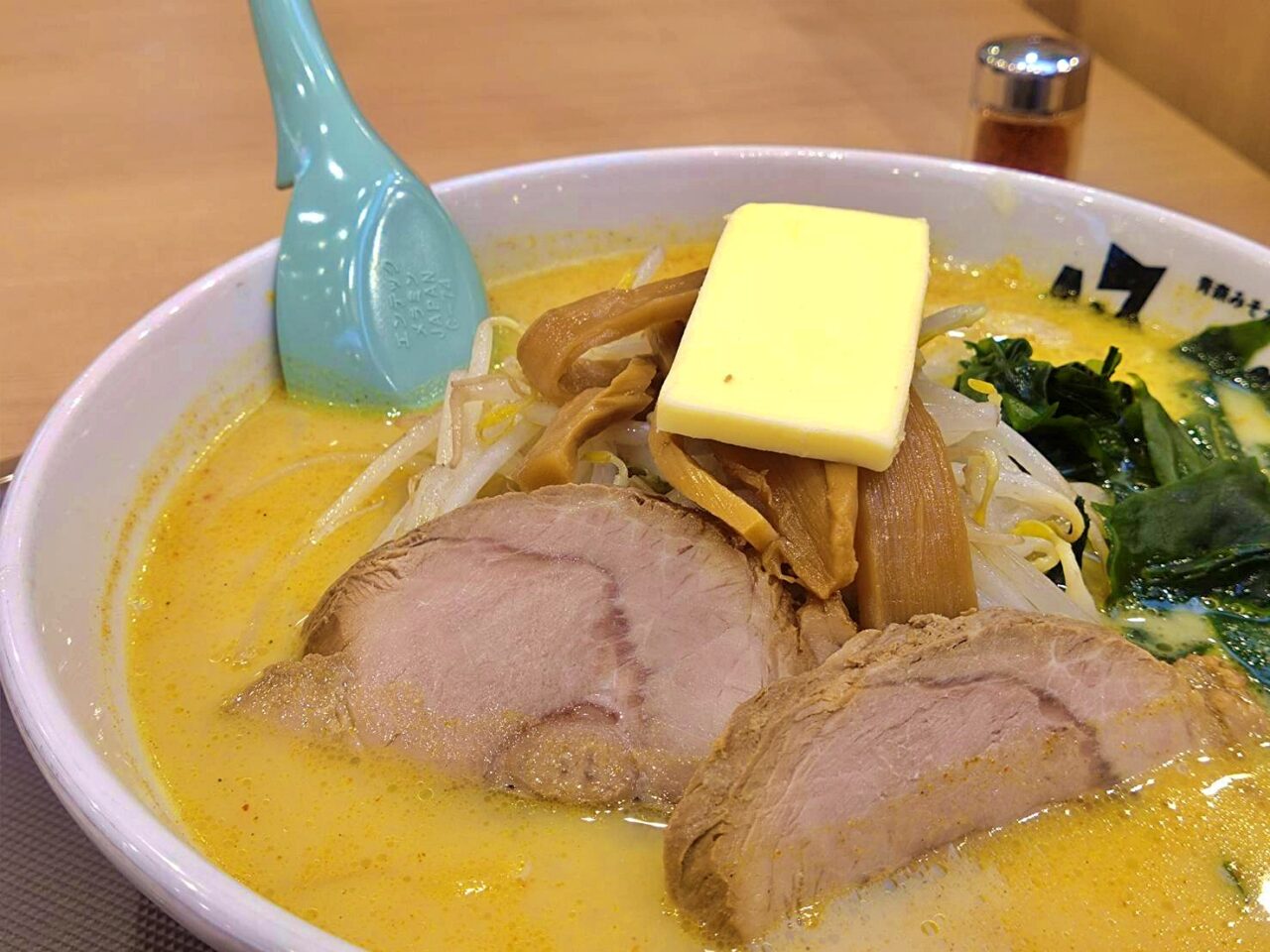 豚骨、鶏ガラ、香味野菜、隠し味の昆布をじっくり煮だした濃厚系スープに、北海道産の白味噌をベースにした特製味噌、カレー粉、牛乳を合わせています。具は、たっぷりのもやし、メンマ、ワカメ、チャーシュー、バターで、正統派の「味噌カレー牛乳ラーメン」です。